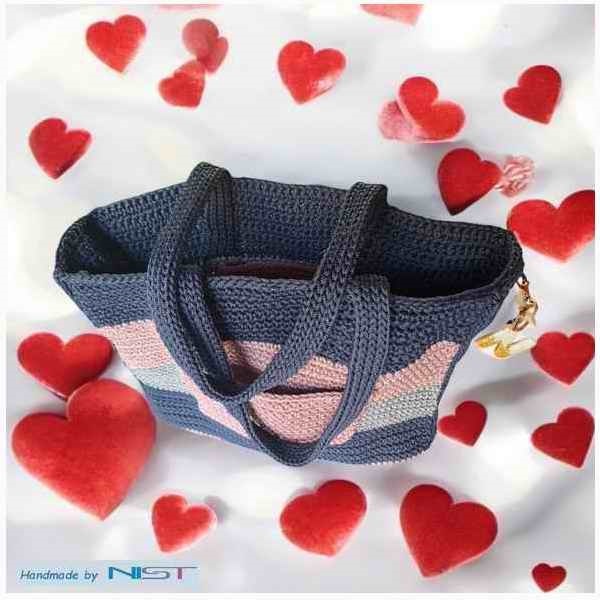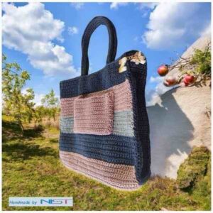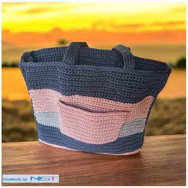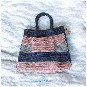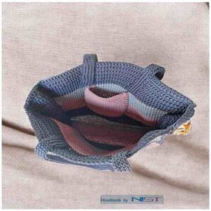 Diese elegante, handgehäkelte Tasche ist in einer Kombination aus gedeckten Blau-, Grau- und Schmutzrosatönen erhältlich und sorgt für einen raffinierten und modernen Look. Das Design ist schlicht, aber wirkungsvoll, mit horizontalen Streifen, die sich in Farbblöcken abwechseln, was die Tasche alltagstauglich macht.