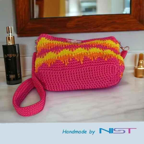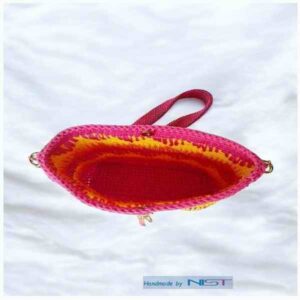 handgefertigte Tasche in leuchtenden Farben passt perfekt zu jedem Stil! Es besteht aus starkem Baumwollfaden und es dominieren zwei Hauptfarben: leuchtendes Rosa und Gelb.