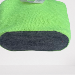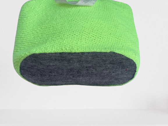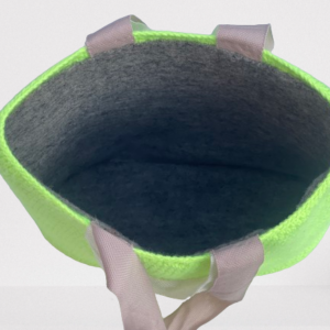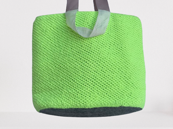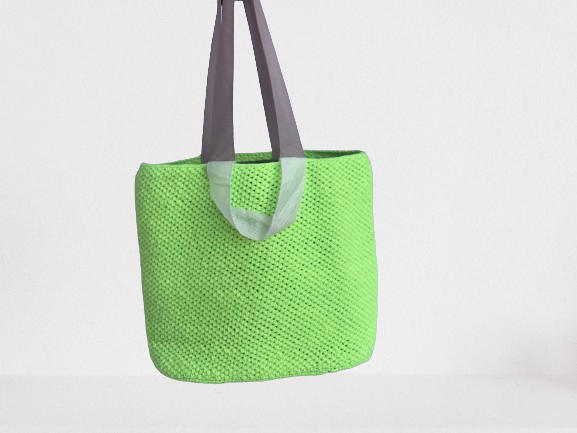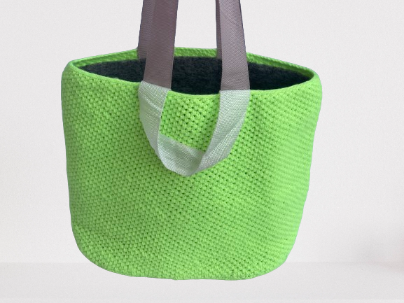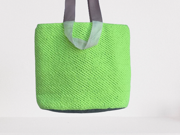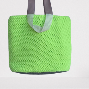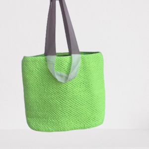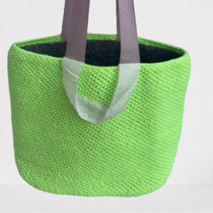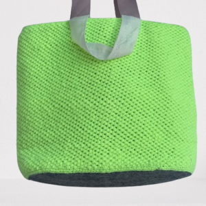Diese handgefertigte Tasche besticht durch ihre leuchtend grüne, gestrickte Außenseite und graue Träger. Die Tasche hat eine strukturierte, gewebte Optik und einen flachen, dunklen Boden.