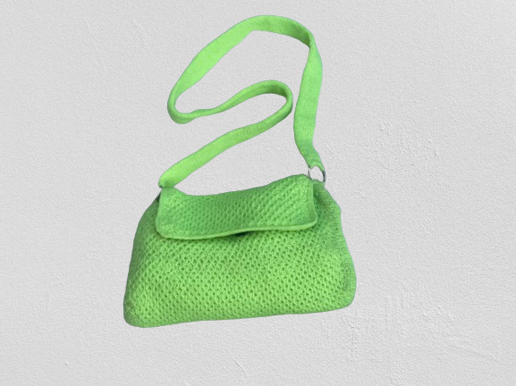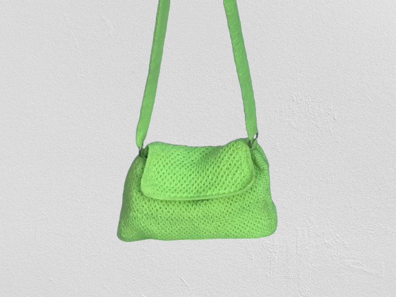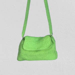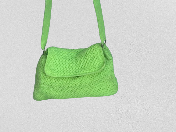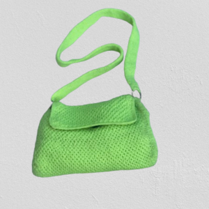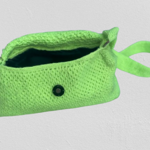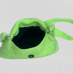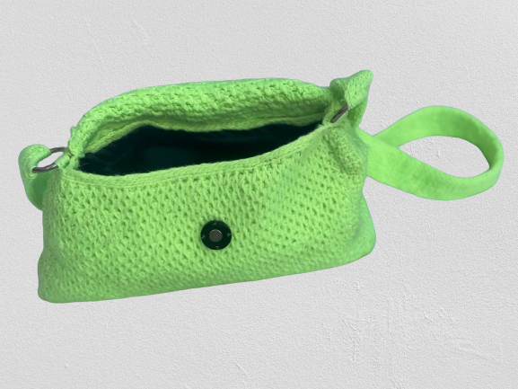 Diese Tasche ist aus hochwertiger Wolle gefertigt und hat eine leuchtend grüne Farbe. Sie hat eine rechteckige Form mit abgerundeten Ecken und einen Klappverschluss. Der Träger der Tasche ist handgestrickt und ebenfalls in leuchtendem Grün gehalten.